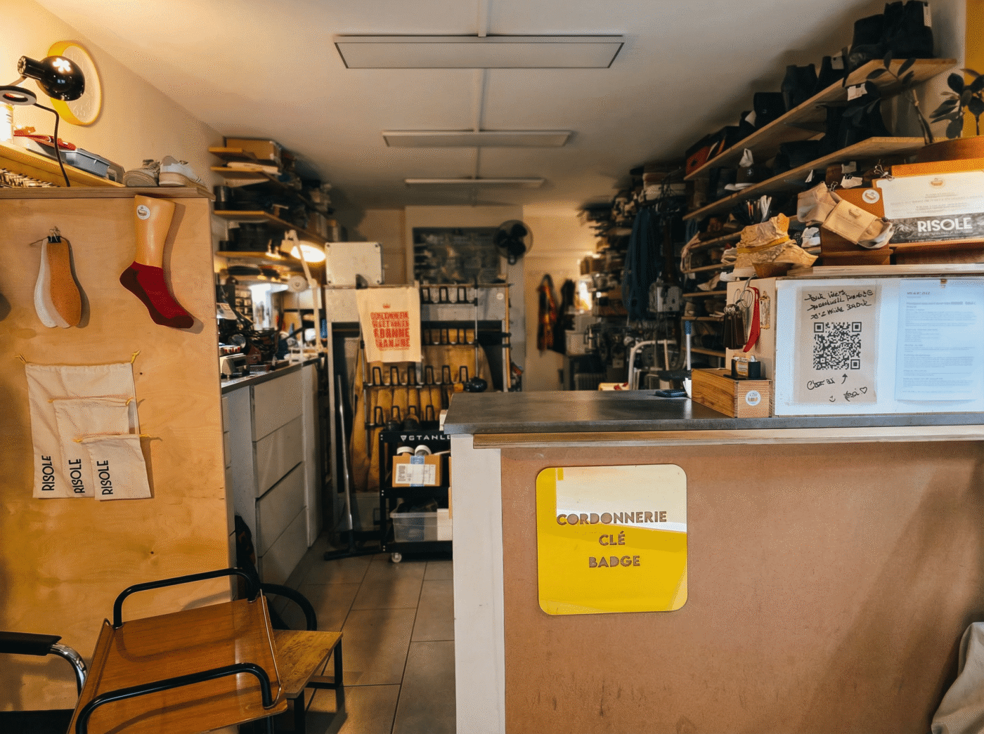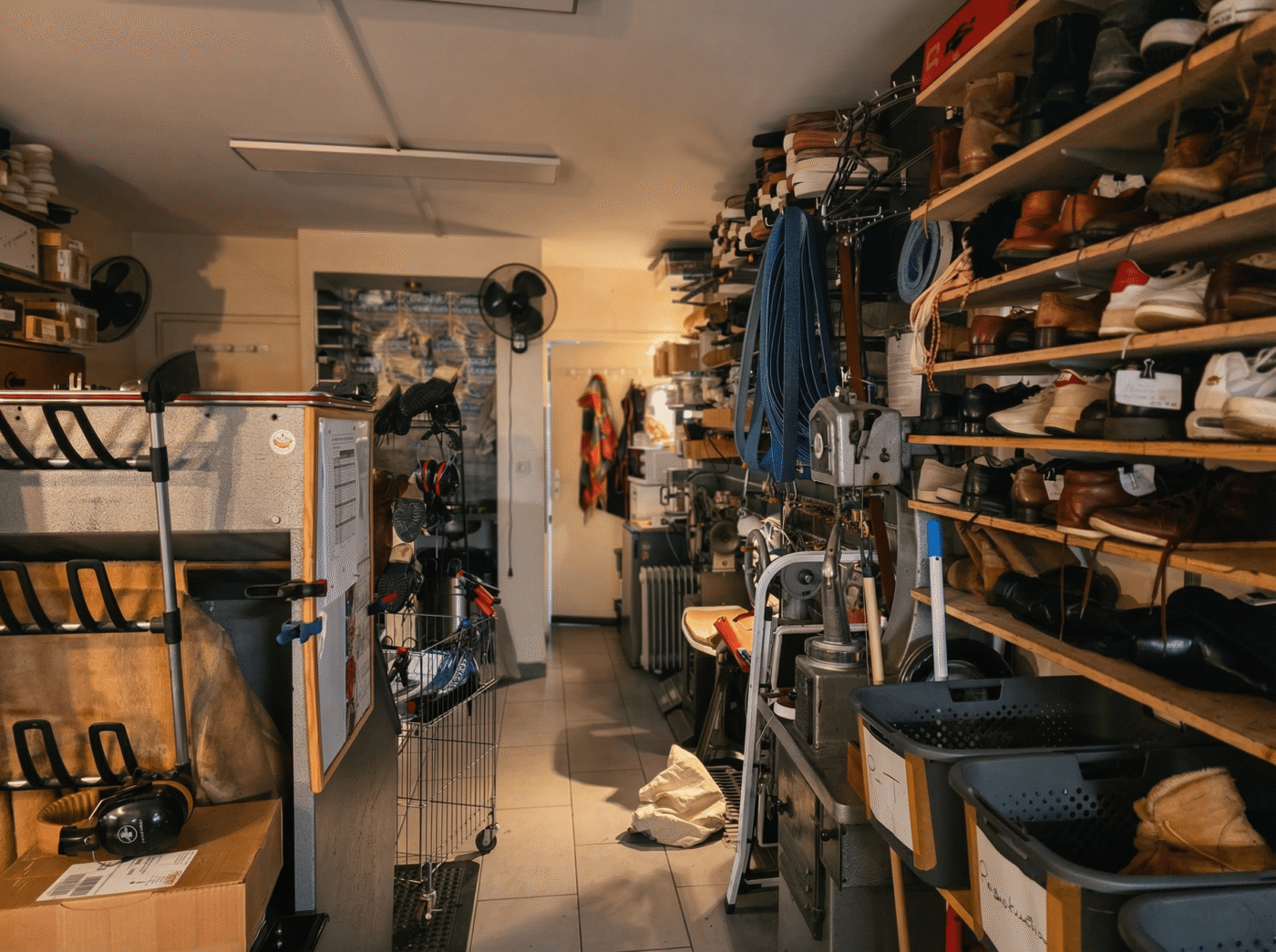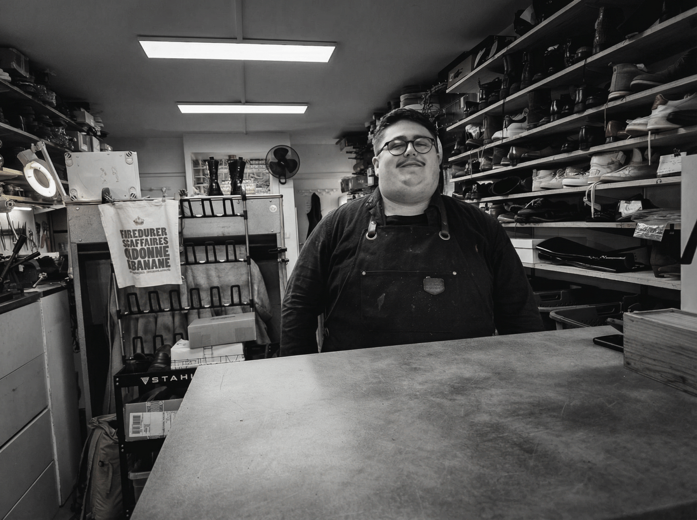 Cordonnerie multiservices, rythme atelier — Roméo intervient sur un grand volume de réparations avec calme et efficacité. Ressemelages, zips, nettoyage, rénovation : il touche à tout et les résultats sont toujours impeccables.