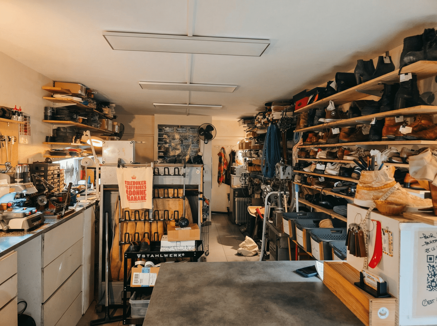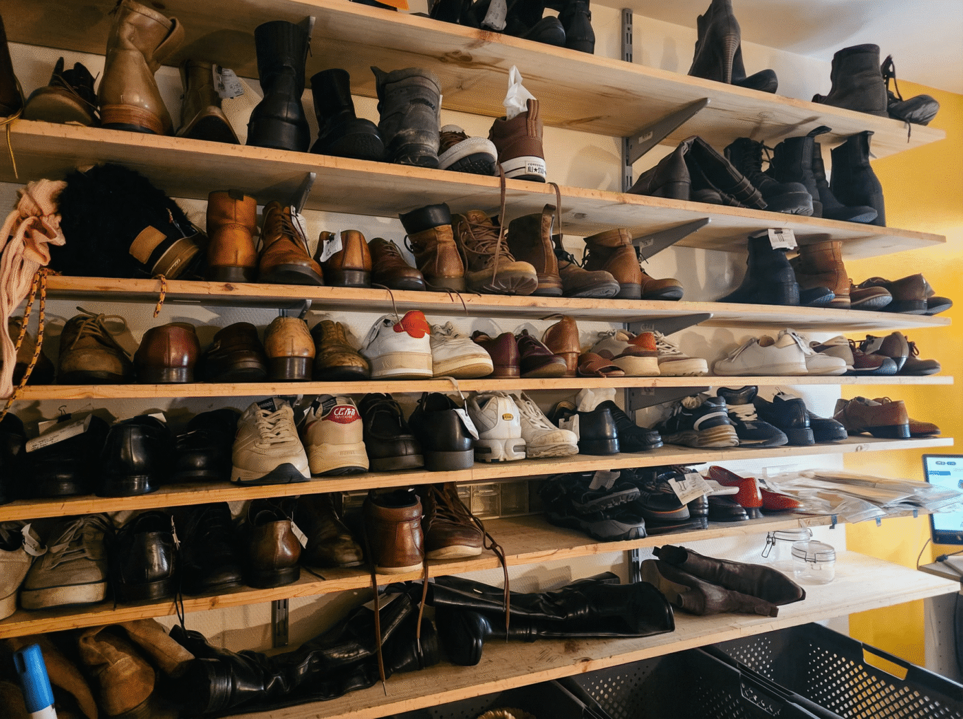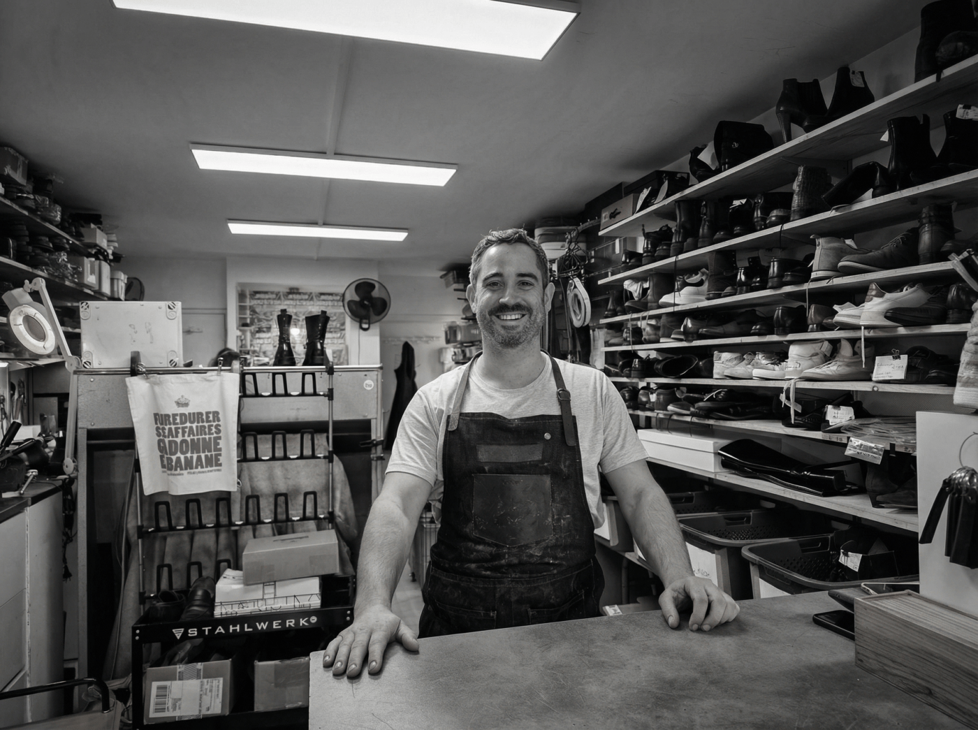 Cordonnerie multiservices, rythme atelier — Roméo intervient sur un grand volume de réparations avec calme et efficacité. Ressemelages, zips, nettoyage, rénovation : il touche à tout et les résultats sont toujours impeccables.